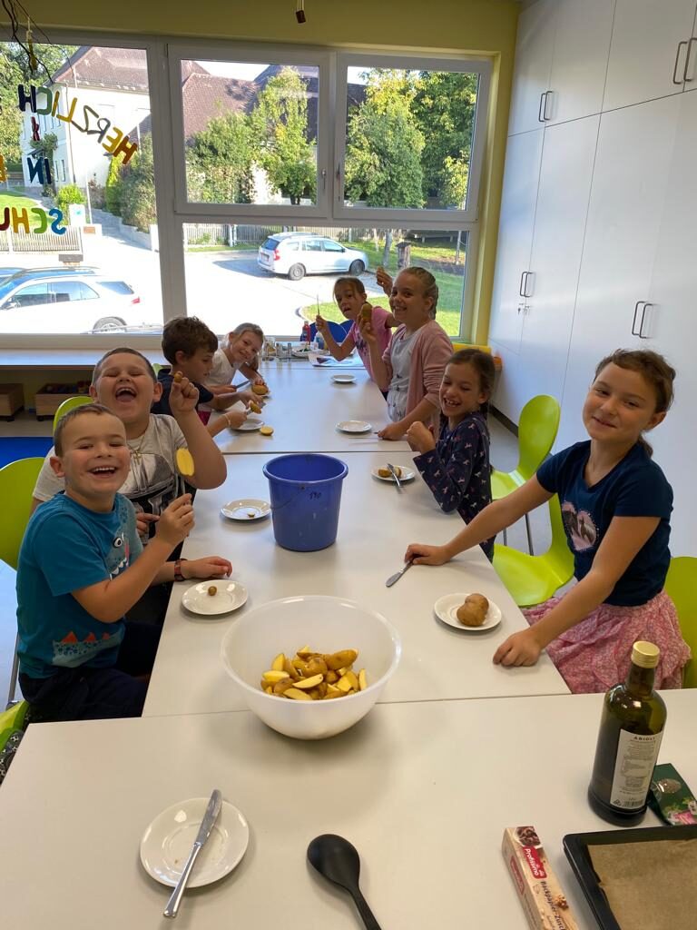 Die Kinder der 3. Klasse beschäftigten sich über mehrere Wochen mit der Kartoffel. Neben dem Erforschen der tollen Knolle, der Ernte im Hochbeet, dem Märchen des Kartoffelkönigs und dem Kartoffeldruck war die Zubereitung von Ofenkartoffeln der krönende Abschluss dieses Projektes.